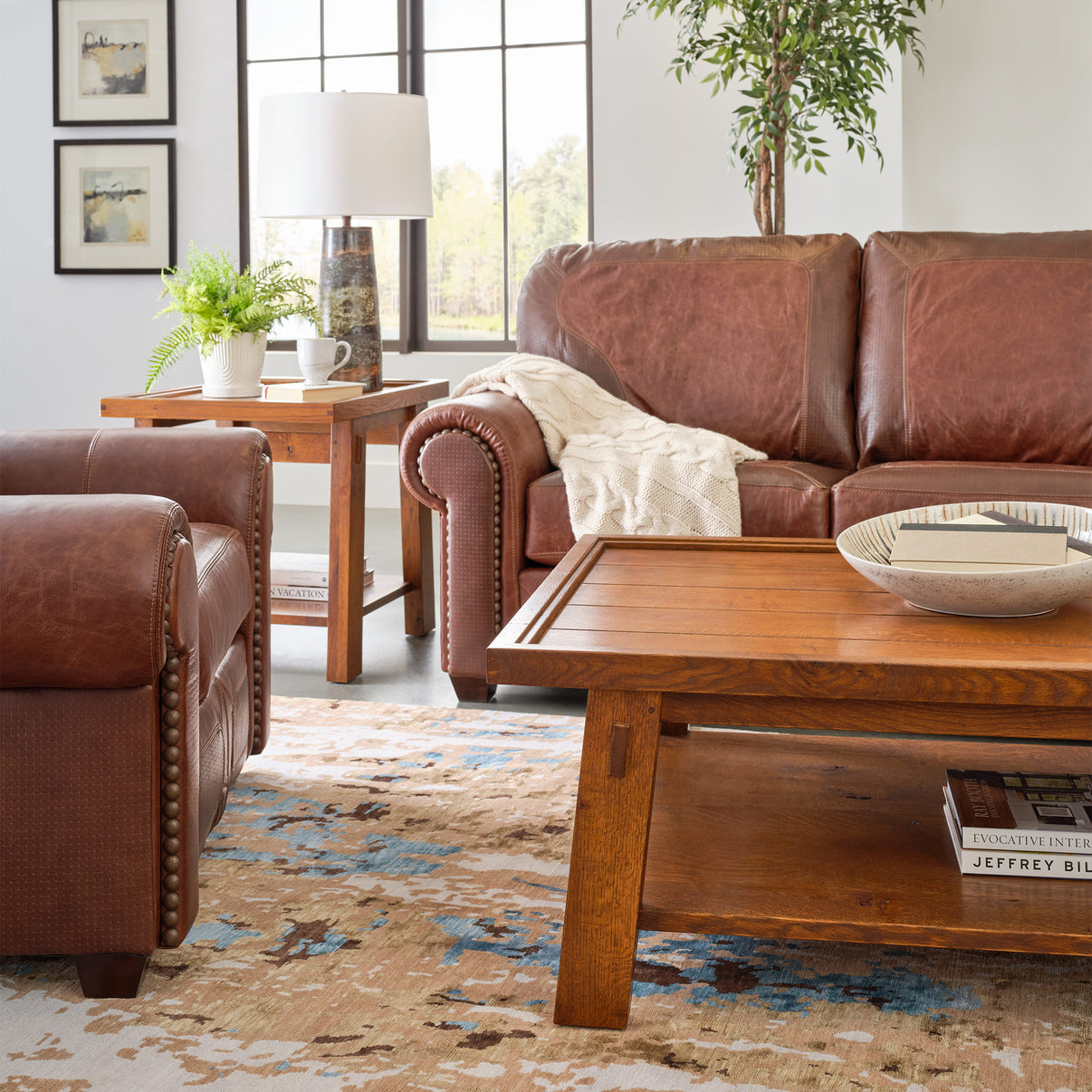 Casual Santa Fe has a grand scale that’s a match for our most generously sized sofas and chairs. Crafted of quartersawn white oak with rustic natural markings such as knots and surface checks, the tables feature V-grooved plank tops bounded by a stepped gallery with splined corner joints. On the Cocktail Table, strong splayed legs are joined with through-tenons and support a broad lower shelf.