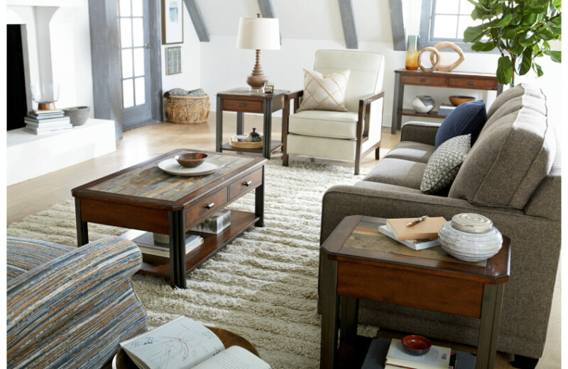 This cocktail table is designed with rustic, industrial and contemporary element making it very popular in todays homes. It is constructed of birch veneers with a slate top and metal legs. It comes equipped with two drawers, one shelf, and casters for easy mobility.