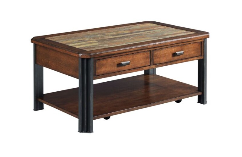 This cocktail table is designed with rustic, industrial and contemporary element making it very popular in todays homes. It is constructed of birch veneers with a slate top and metal legs. It comes equipped with two drawers, one shelf, and casters for easy mobility.