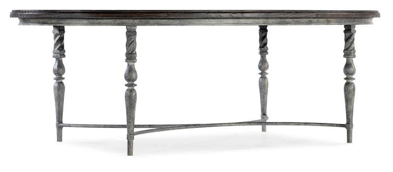 Create a comfortable and inviting atmosphere of retreat for your family room with the Traditions Oval Cocktail Table, featuring a Pine top in the rich brown Maduro finish with grey undertones and a decorative veneer pattern. The metal base includes delicately-shaped legs and a metal stretcher. Solid wood edge top.