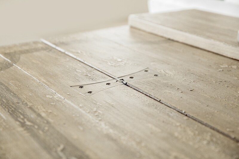 With a chic French industrial look, you can use this metal and wood console as a sofa table, desk and even for extra dining when guests arrive. Two leaves on either side flip open, and pull-out supports brace the leaves when open. The soft Flaky White finish over Poplar and Hardwood Solids with Maple Veneers contrasts with the Aged Iron base.
