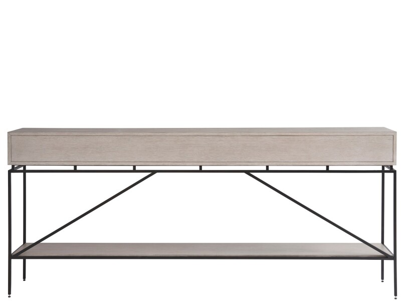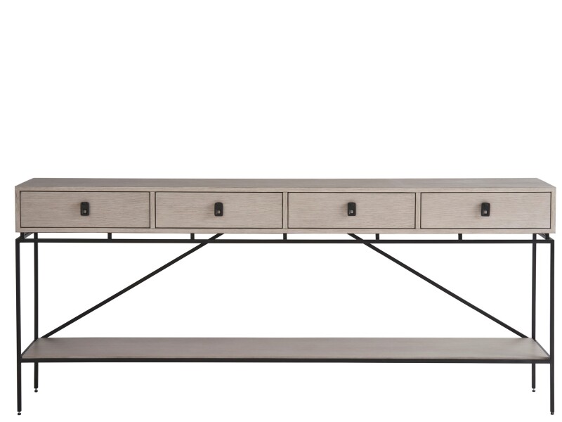 The Barber Console stands with poise in its Rolling Fog finish, its form punctuated by striking metal hardware. Metal legs and detailing infuse the piece with a dynamic interest, while its clean lines introduce a crisp, contemporary twist.