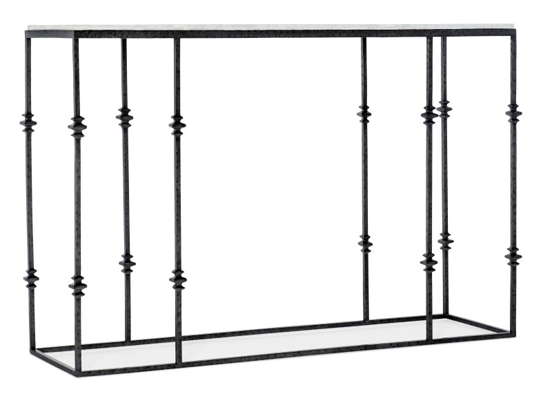 With an airy and artsy aesthetic, the lightly-scaled Stone & Metal Console features a gray metal base with layered square turnings with a Venetian White Marble top. The 12-inch depth makes this piece versatile for a variety of spaces.