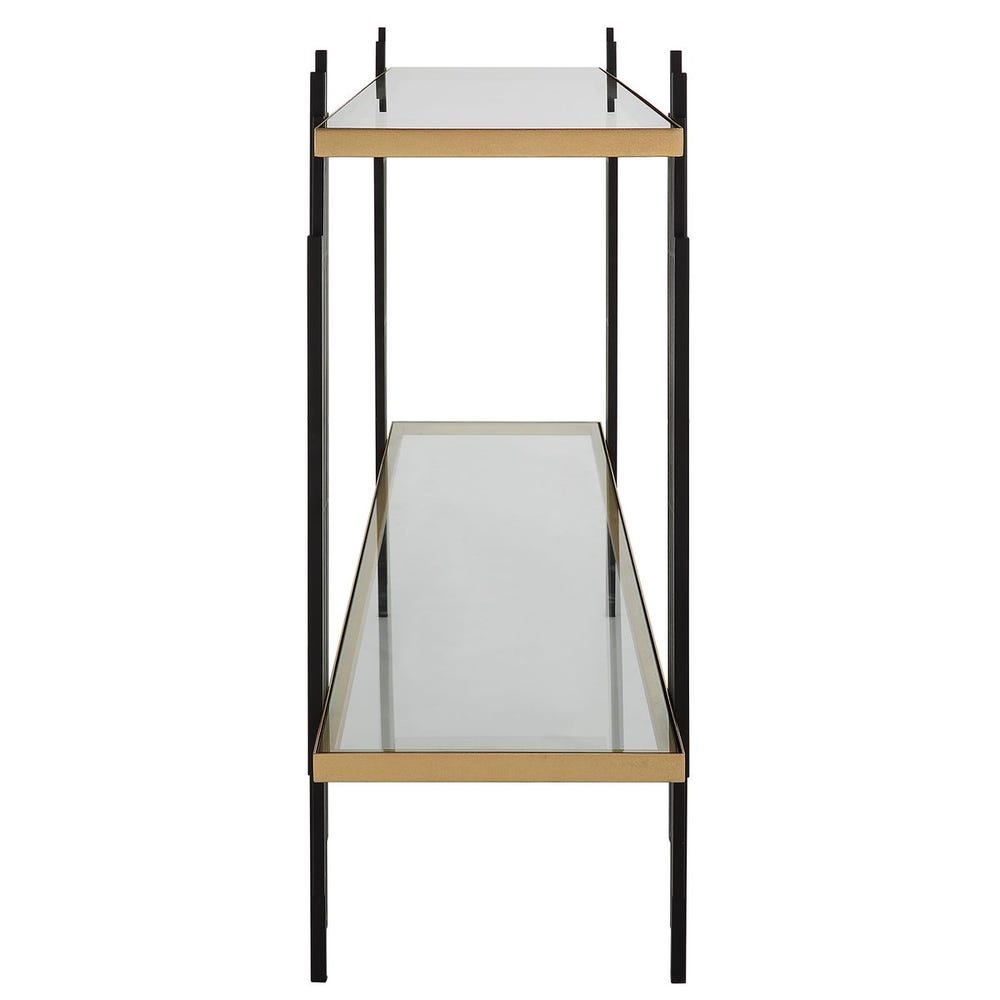 Gold leaf shelves seem to float between matte black iron legs reminiscent of a cityscape. Two shelves are clear tempered glass.
