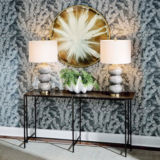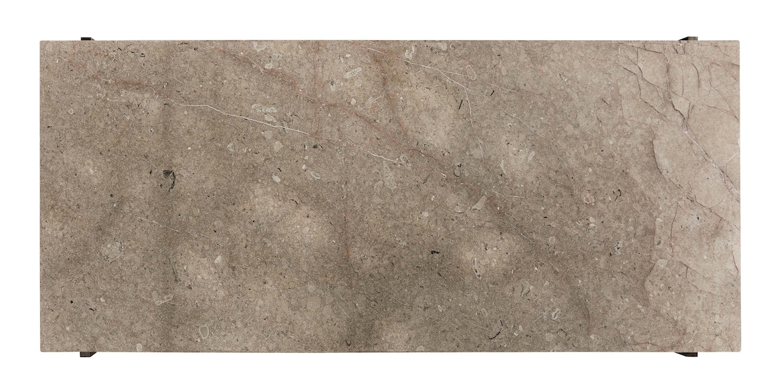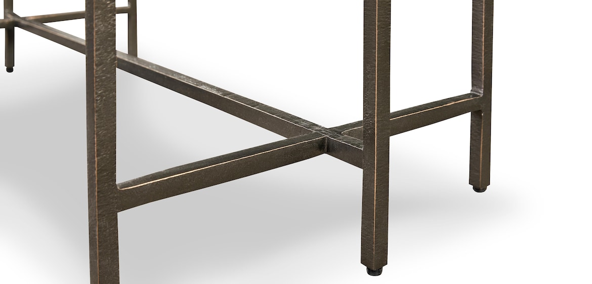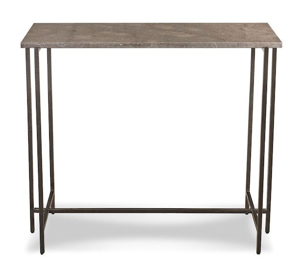 Warm and sophisticated, the Exmore console table is a thing of lasting beauty. Though it sits to the side of an entry or behind a sofa, it’s velvety smooth ¾” Greystone marble top makes a memorable impression with natural streaks of red, rust, and white. Angular details in the clean-lined welded metal base are finished with a hand-applied, textured bronze finish. The stone top is sealed for added protection, though coasters are recommended.