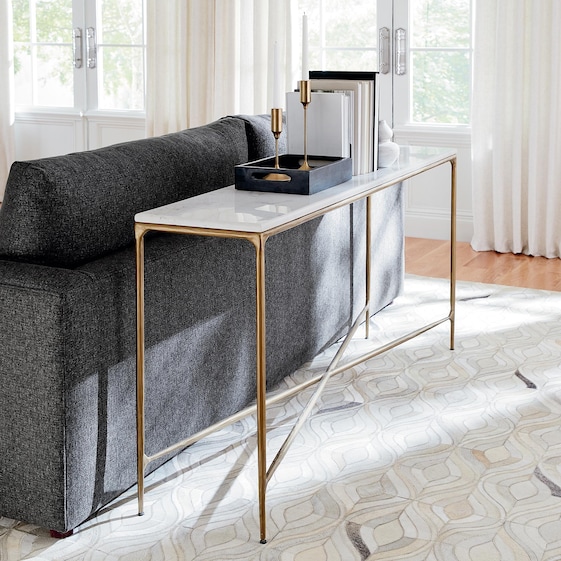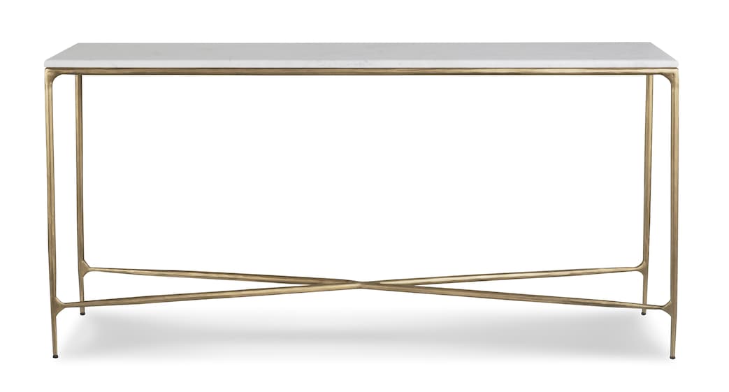 A treasured piece in enduring Banswara marble, the Keswick console table brings rustic elegance to an entryway or hallway. Natural streaks of blush, gray, and purple vein the lustrous white marble, adding interest to the smooth-edged beauty of the stone. Slender, gently tapered legs are visually strengthened with cross support. The distressed bronze finish comes from a carefully hand-applied, durable, and low-maintenance powder coat. This highly prized Banswara marble table is sealed for protection, though coasters are still recommended.