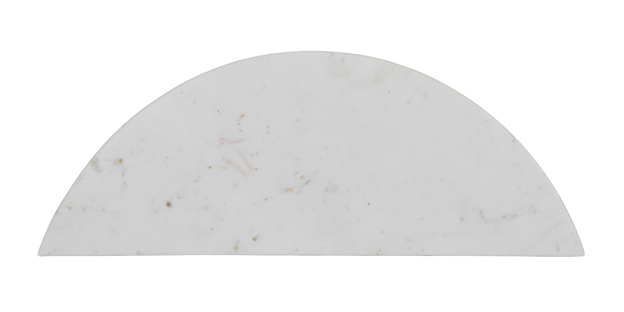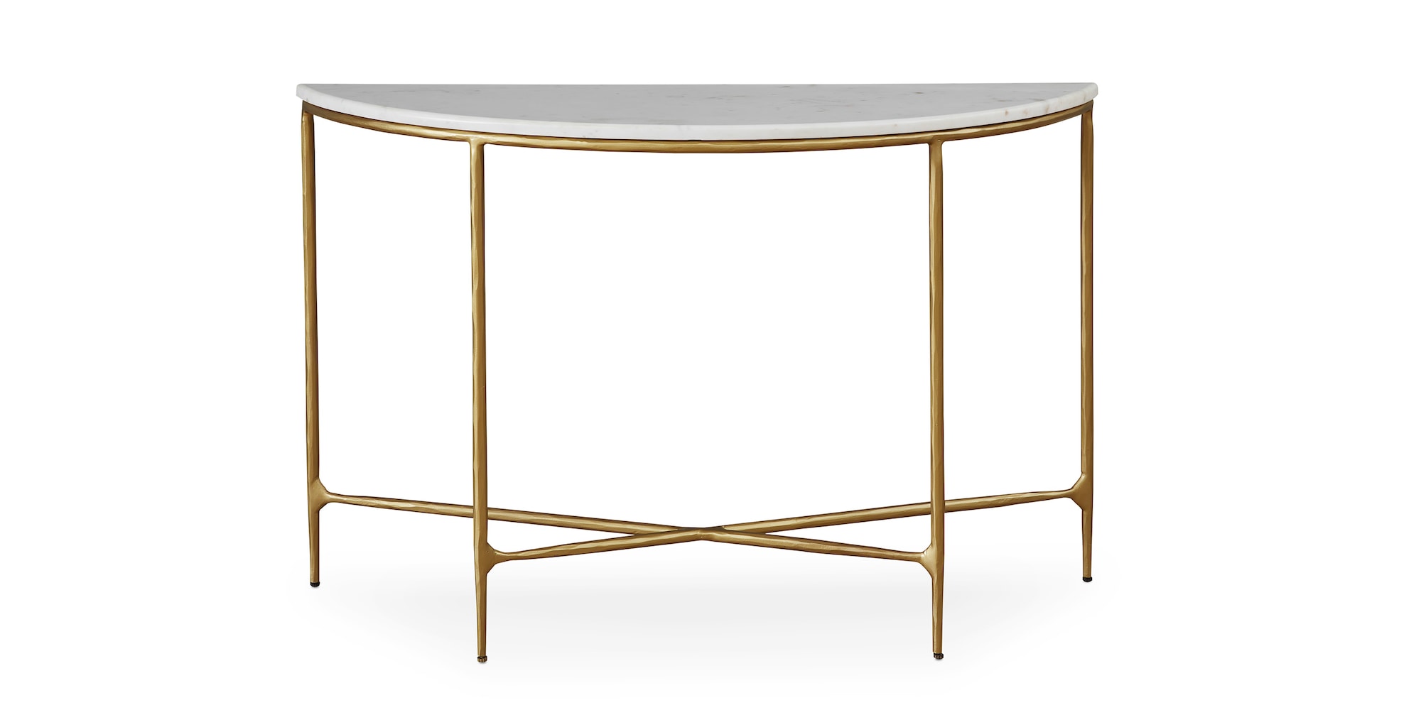 A treasured piece in enduring Banswara marble, the Keswick console table brings rustic elegance to an entryway or hallway. Natural streaks of blush, gray, and purple vein the lustrous white marble, adding interest to the smooth-edged beauty of the stone. Slender, gently tapered legs are visually strengthened with cross support. The distressed bronze finish comes from a carefully hand-applied, durable, and low-maintenance powder coat. This highly prized Banswara marble table is sealed for protection, though coasters are still recommended.