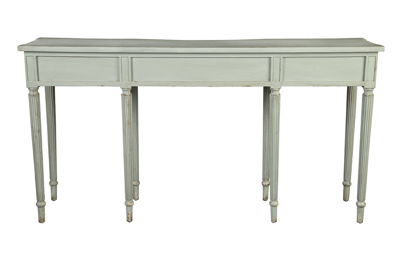 Finely wrought of solid mahogany, this delicate console features a serpentine top, while the turned legs and shaped drawers are embellished with hand carved fluting. The hand distressed aged finish is a soft cloud blue which will bring a dreamy touch to your interior. For ease of transport, this sweet console is “flat packed,” and the legs just screw on. An easy DYI with a lot of design impact for your home.