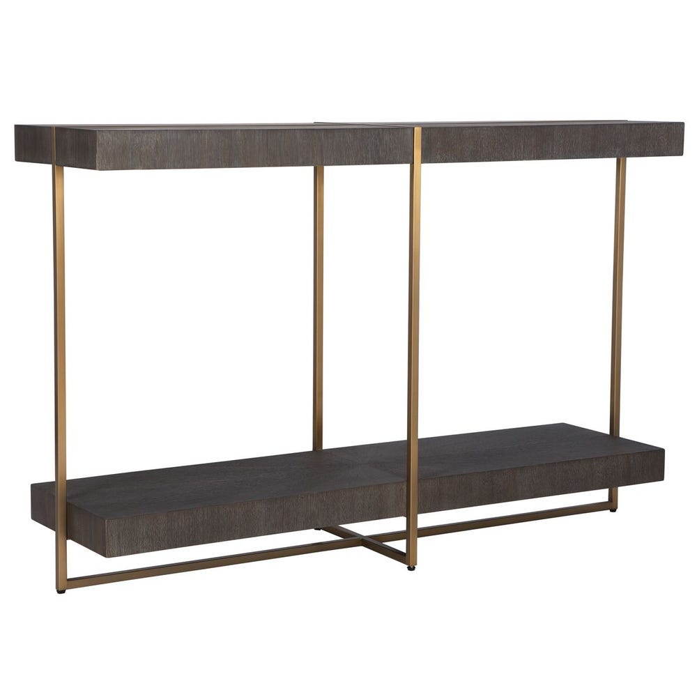 Contemporary in style, this console table features a stainless steel framework finished in a brushed brass with a starburst acacia veneer top in a dark walnut stain washed with a light gray glaze.