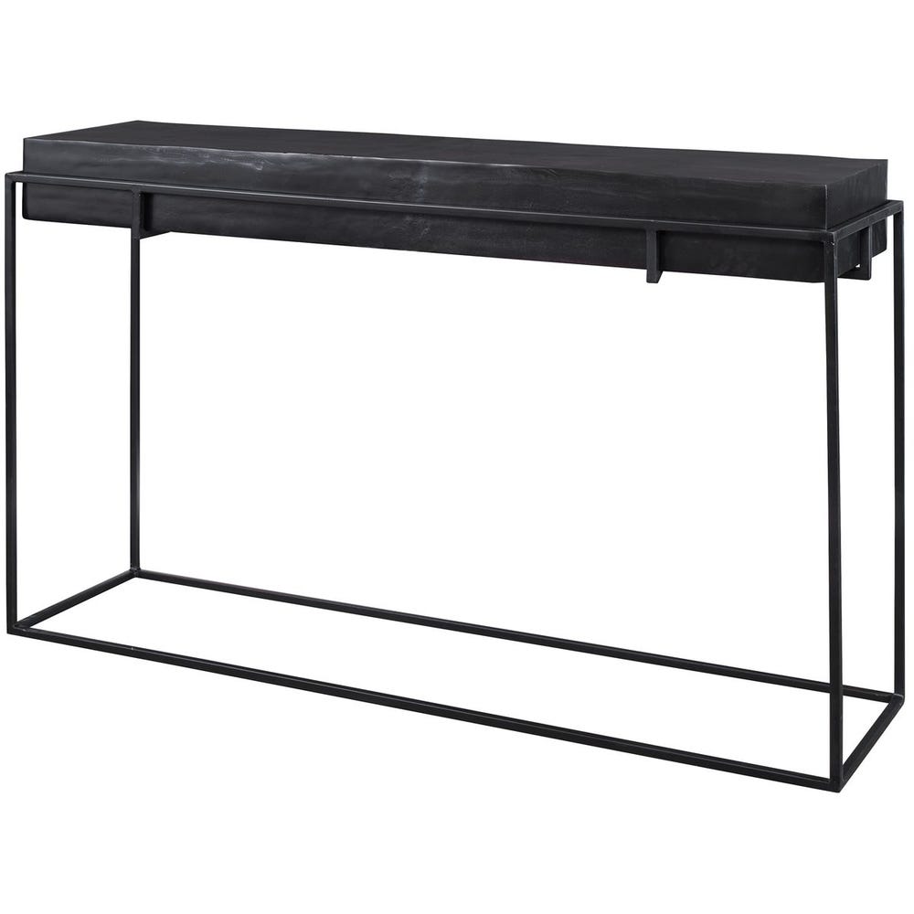 With modern minimalist styling, this console table features a thick cast aluminum top with natural texturing finished in a plated antique black, resting in a coordinating aged black iron base.