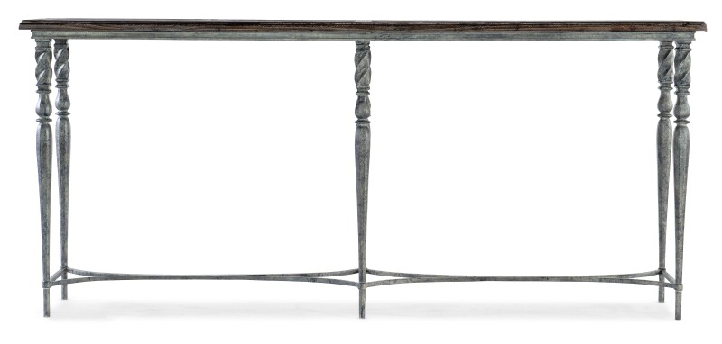 With a designer flair and vintage character, the Traditions Console Table combines a pine top in the rich brown Maduro finish with grey undertones with a metal base with 6 slender shaped legs and stretchers. At only 14 inches deep, the narrow shape allows the console to maximize small spaces.