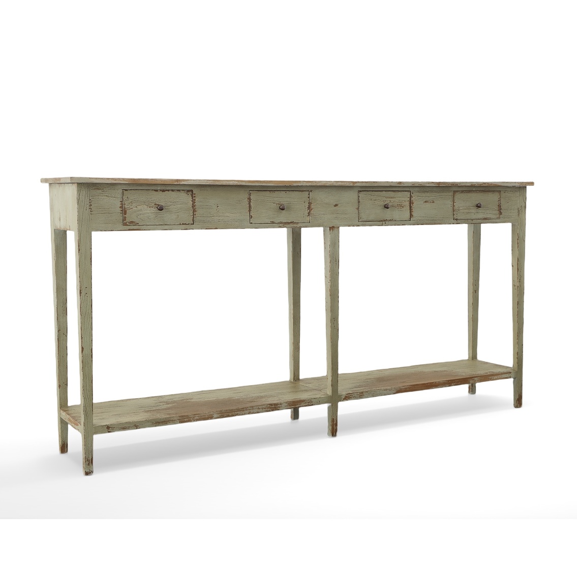 Long and narrow, this slender console is crafted of oak and mahogany and boasts a distressed gray finish. The lower shelf is just the thing for displaying favored ceramics, or organizing the family’s shoes! Perfect for organizing the stuff of life, there are four smaller drawers scaled to allow quick searches for keys and chargers.