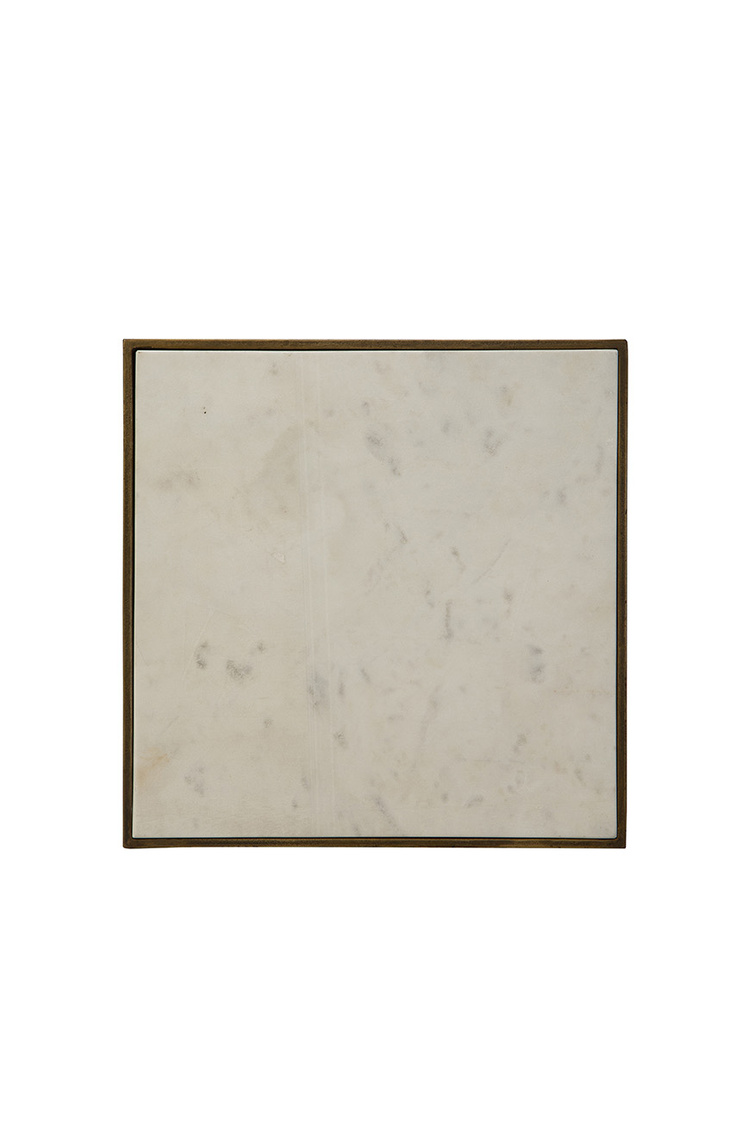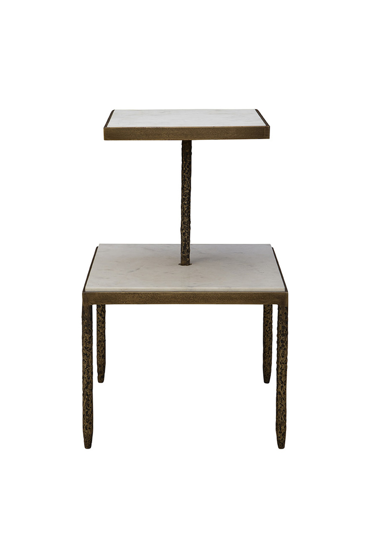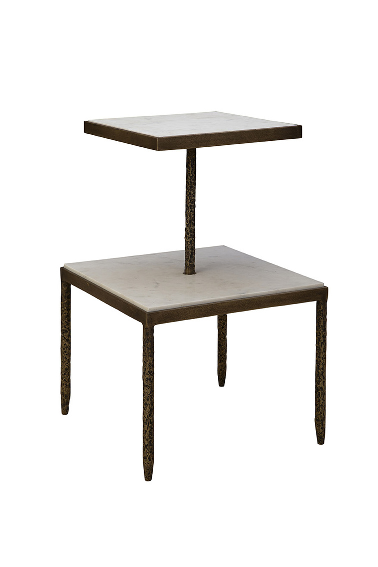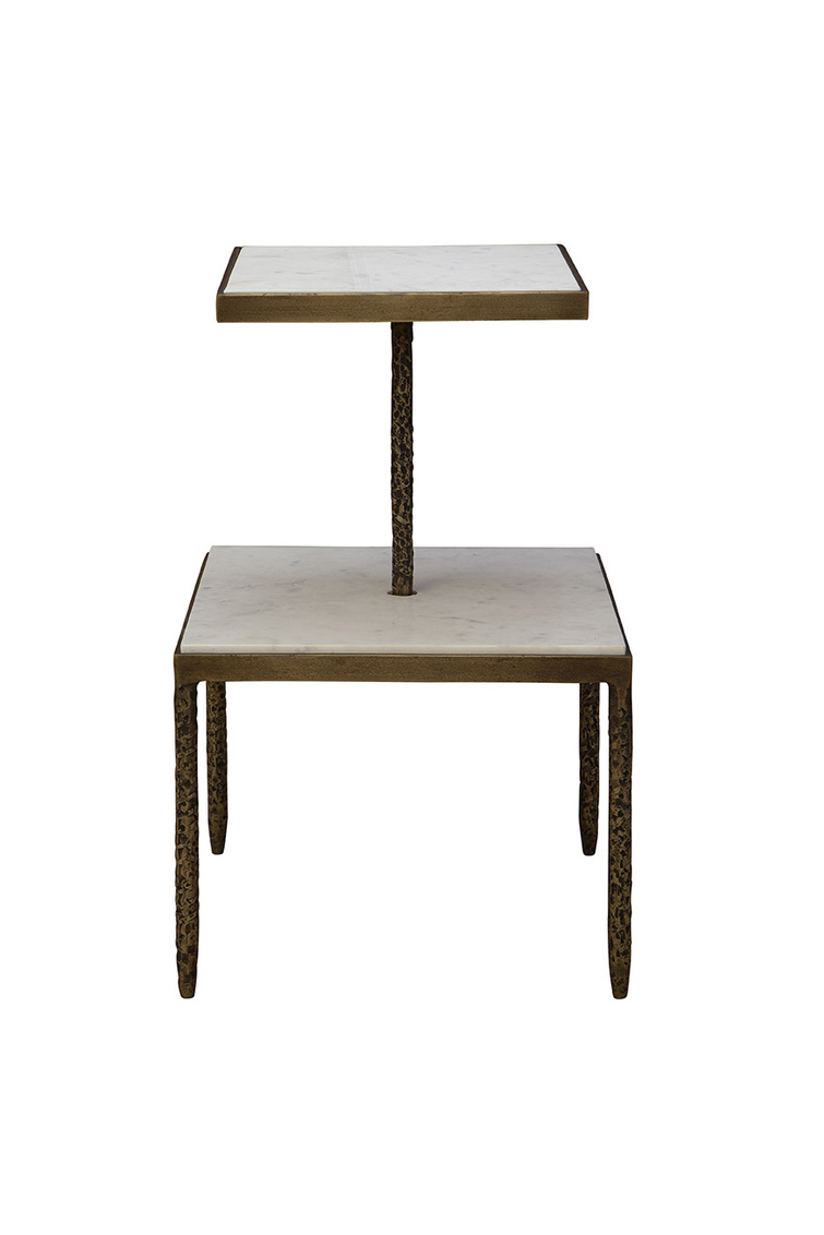The Antony Side Table is a truly unique design that feels like a table atop a table. The “bottom table” features a square white marble top supported by four hammered metal legs. Rising from the center of this base is a singular hammered metal beam that holds the “top table,” a smaller square white marble surface. This sculptural and artistic piece brings a bold and eye-catching element to any space while maintaining functionality.