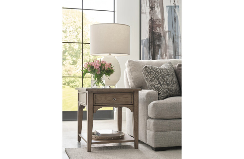 The casual feel of our Beatrix Drawer end table will blend well in in setting. It is constructed of split-heart cathedral white oak veneers in a Latte finish with Dark Nickel finished hardware. It features one drawer & one shelf for ample storage.