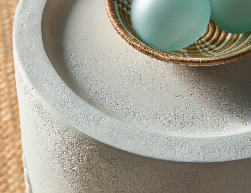 The Amelia Round End Table mirrors the design of the cocktail table with its textured plaster-like finish and embossed leaf motif. Crafted from wood and resin, it features a round shape and durable construction. Its clean, white tones make it a perfect addition to any contemporary or casual space, providing function and style in a smaller footprint.
