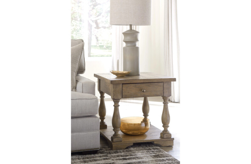 The Donelson Rectangular End Table coordinates well with the Donelson Coffee Table with the same planked style top and shelf. This end table has one drawer for storage. Some assembly is required.