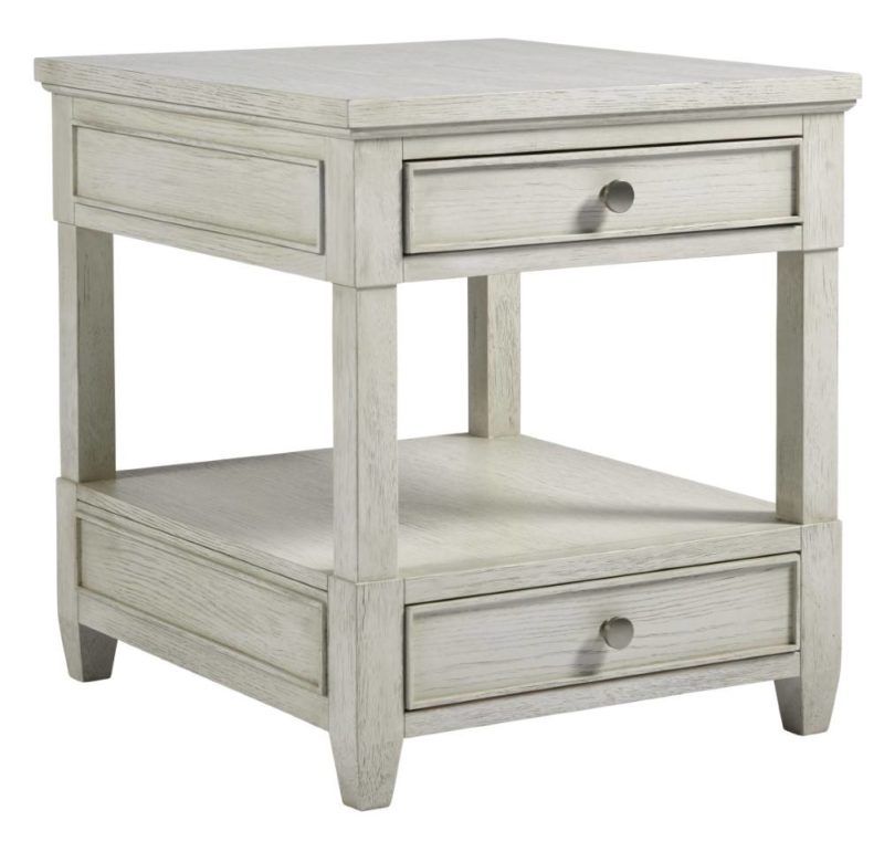 Built with two spacious drawers and an abundance of open-air display space, the Escape Drawer End Table pairs a light finish with sleek silver knobs.