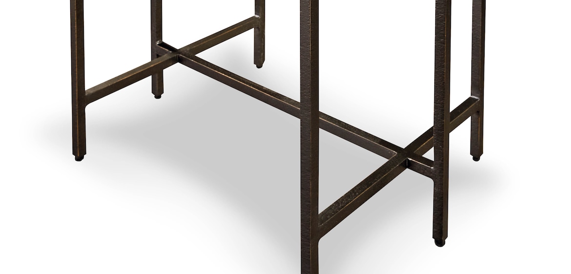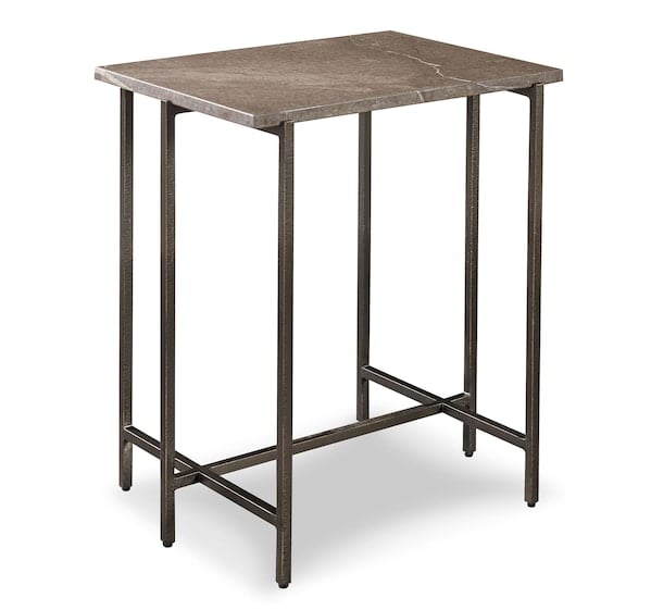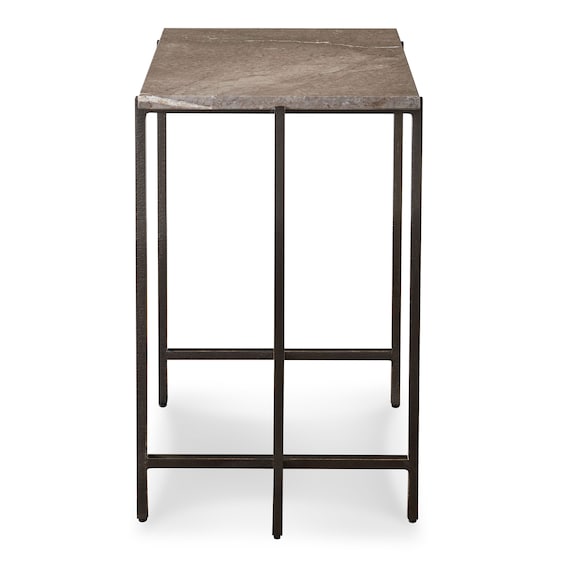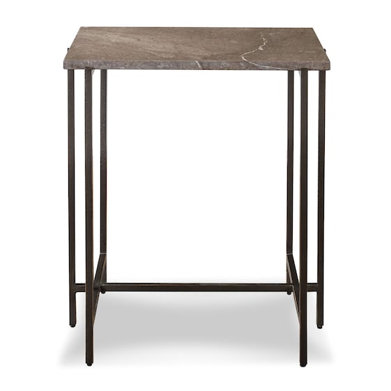 Rest a hand on the velvety Greystone marble top of the Exmore end table, and you’ll find the smooth natural marble as cool and sophisticated as it looks. An angular bronzed metal frame gives the table a sturdy, linear appeal. Accented with streaks of rust, brown, and white, the ¾” thick marbled surface has been sealed for added protection, though coasters are recommended.