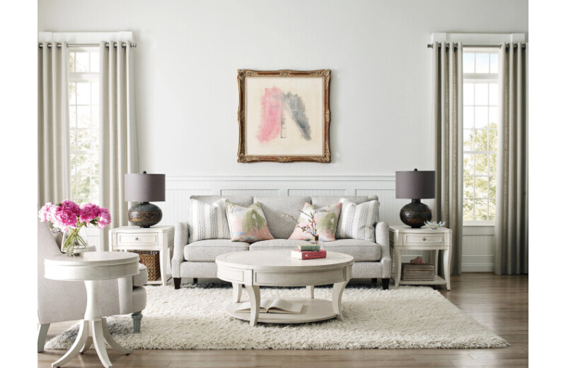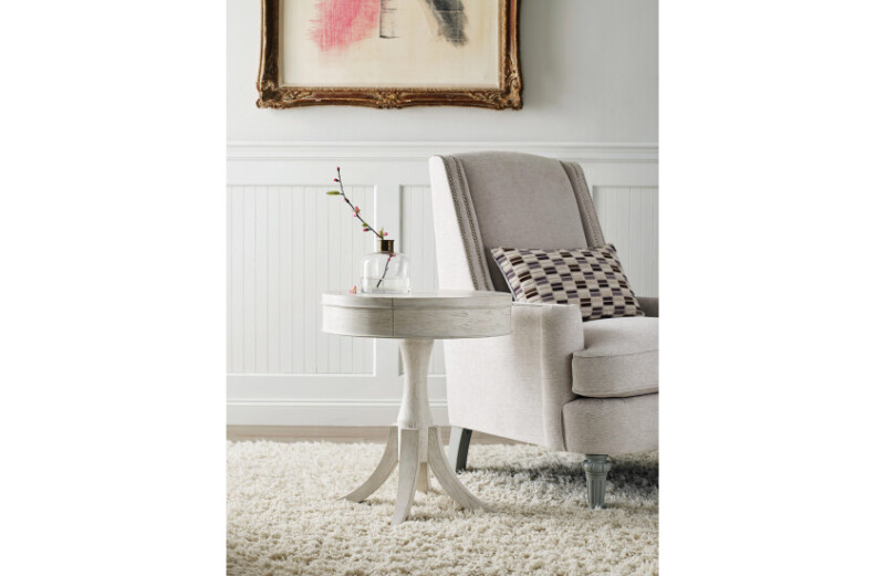 This round end table is constructed of cathedral white oak veneers in and Eggshell finish and measures 22 inches in diameter and 24 inches high. It is the perfect piece to host beside your favorite chair.