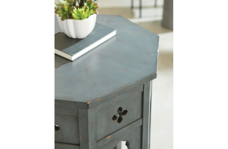 Hex end table has dimension, style and a lot of look with the reclaimed solids used to make it stand on its own.