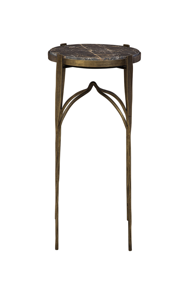 The Johnson Side Table is a simple yet elegant petite piece, perfect for holding a martini or accenting any space. Featuring a circular marble top set within a brass frame, it sits atop four brass legs. The legs are designed with thicker sections near the top, transitioning to a slimmer profile for a refined touch. This table combines functionality with understated style.