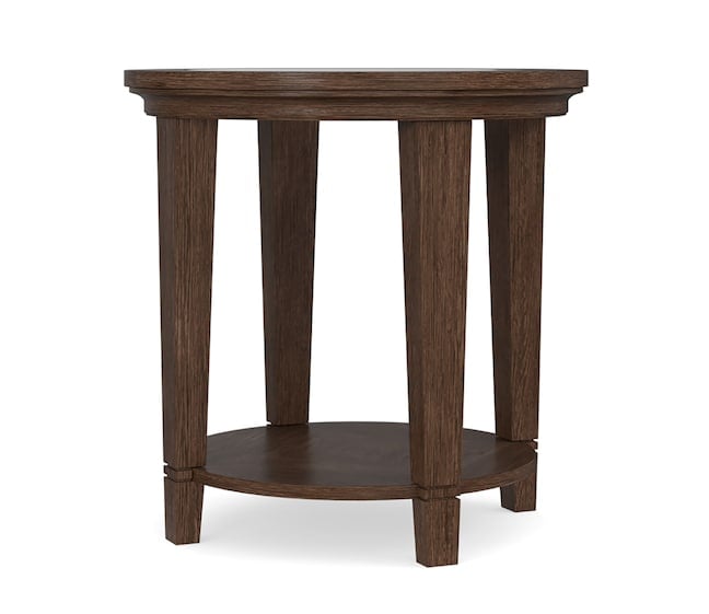 Infuse the soft warmth and curves of this classic silhouette, moderately scaled round lamp table into your living room decor. Made with elm veneers and Asian hardwoods, the dark Tavern finish highlights the wood’s natural character. This table features a glass top insert, gently tapered legs with a decorative notching detail, and a fixed wood display/storage shelf. Works great in traditional, transitional, and modern spaces and looks wonderful in pairs on either side of a sofa or loveseat or paired with a chair. Mix with wood-top pieces for variety.