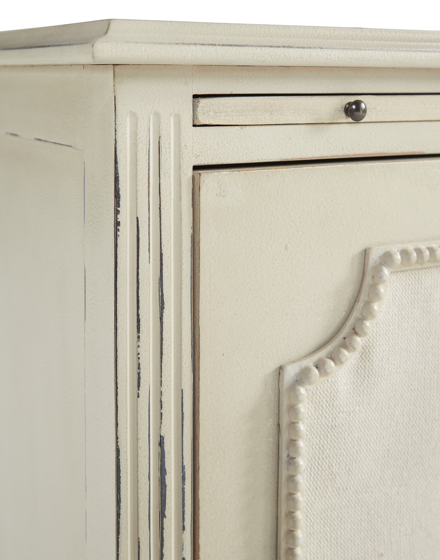 This small end table of plantation grown mahogany packs a huge design punch. Beaded accents with a linen interior panel and center cabachon is the perfect addition for a smaller space.Weather beside the bed, sofa, or your favorite chair, it will be at home in your interior.