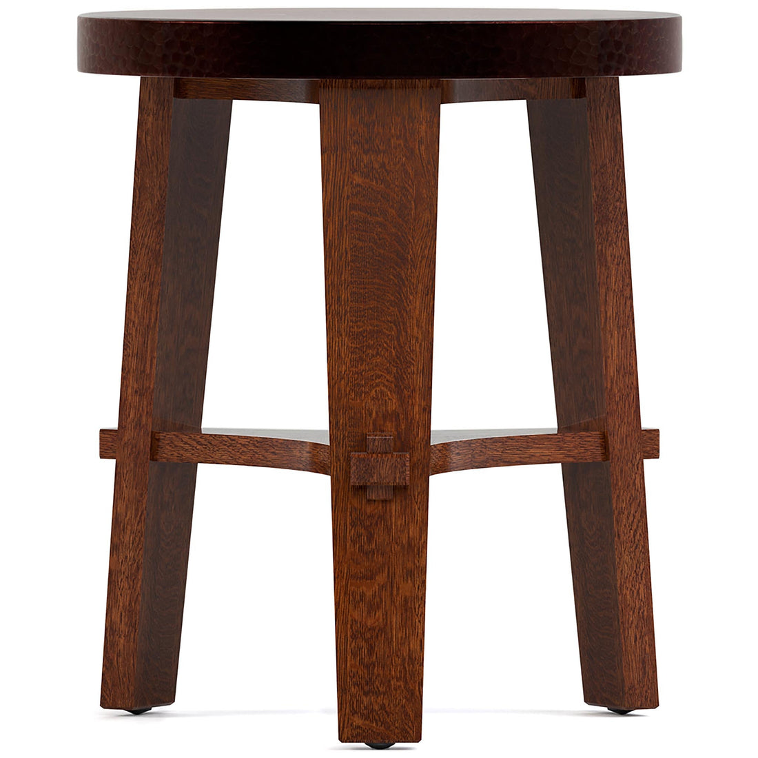 In our Little Treasures collection, you’ll find modestly scaled oak pieces crafted with Mission techniques and designed for a variety of uses. The Copper-Top Tabouret is inspired by a Stickley Brothers design circa 1910. A round top of hammered copper sits on a solid-oak frame made up of three tapered legs and a stretcher shelf attached with through-tenon joinery. Its low height allows the tabouret to serve as a small table, stool, or plant stand.