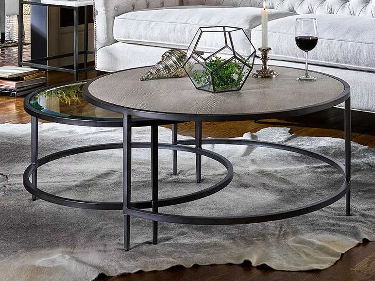 The perfect expression of tone and balance, the Midtown Nesting Tables feature one larger inset wooden top and a smaller inset beveled glass top framed by a bold and striking metal body.