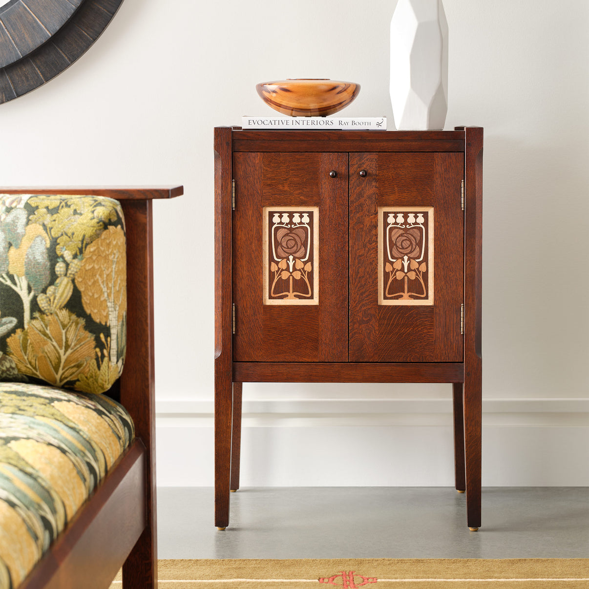 The 2024 Collector Edition Mission Rose Cabinet is a small piece that holds countless possibilities, perfect for use as an entry cabinet beneath a mirror, a bedside or chairside table, a linen cabinet, or even a miniature bar. Standing on light, tapered legs, the slender case of solid American white oak is defined by bold chamfered corners with rounded stops, honoring and modernizing a traditional carpenter’s detail; other familiar Mission features include exposed pin joints and through-posts with subtle pyramidal tops. Inside, an adjustable shelf allows for customizable storage. And finishing the piece in breathtaking fashion, two large, slightly recessed inlays recreate an early Stickley Brothers design—itself influenced by British Art Nouveau—in beautiful decorative wood veneers.