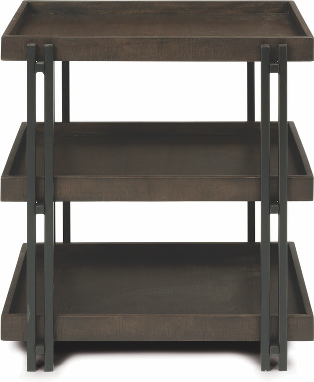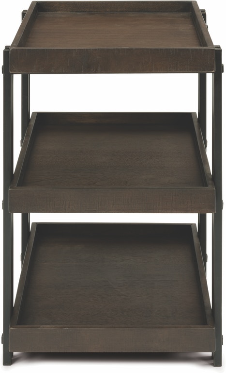 Bring contemporary style that highlights both form and function to your living spaces with the Prairie end table. A tray-style top is ideal for displaying decorative items, while two additional tray-style shelves offer plenty of storage space for books, magazines and other essentials. This attractive yet practical table showcases a rich, dark finish on the walnut veneers and also features rough-sawn edge banding for added texture and visual appeal. Refined metal legs in a gunmetal finish pull the look together and provide a mixed-media aesthetic to the design.