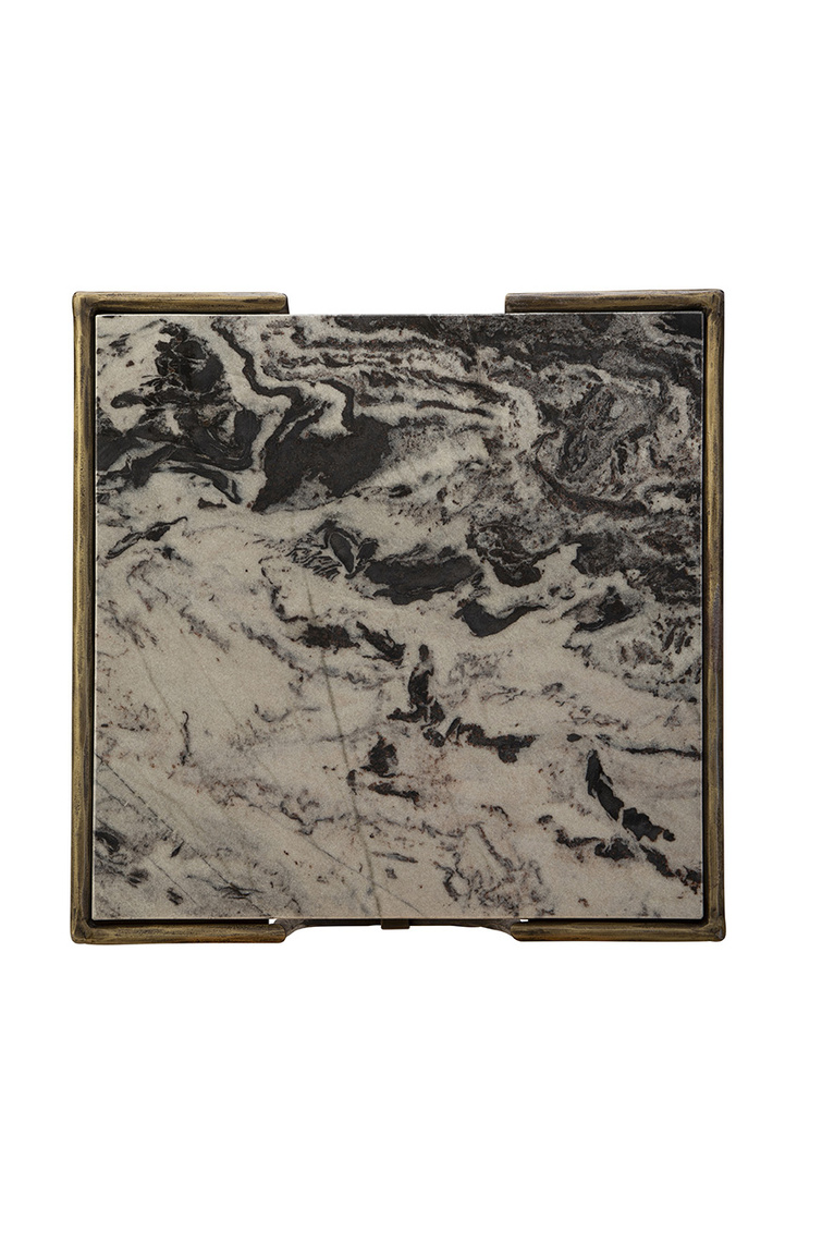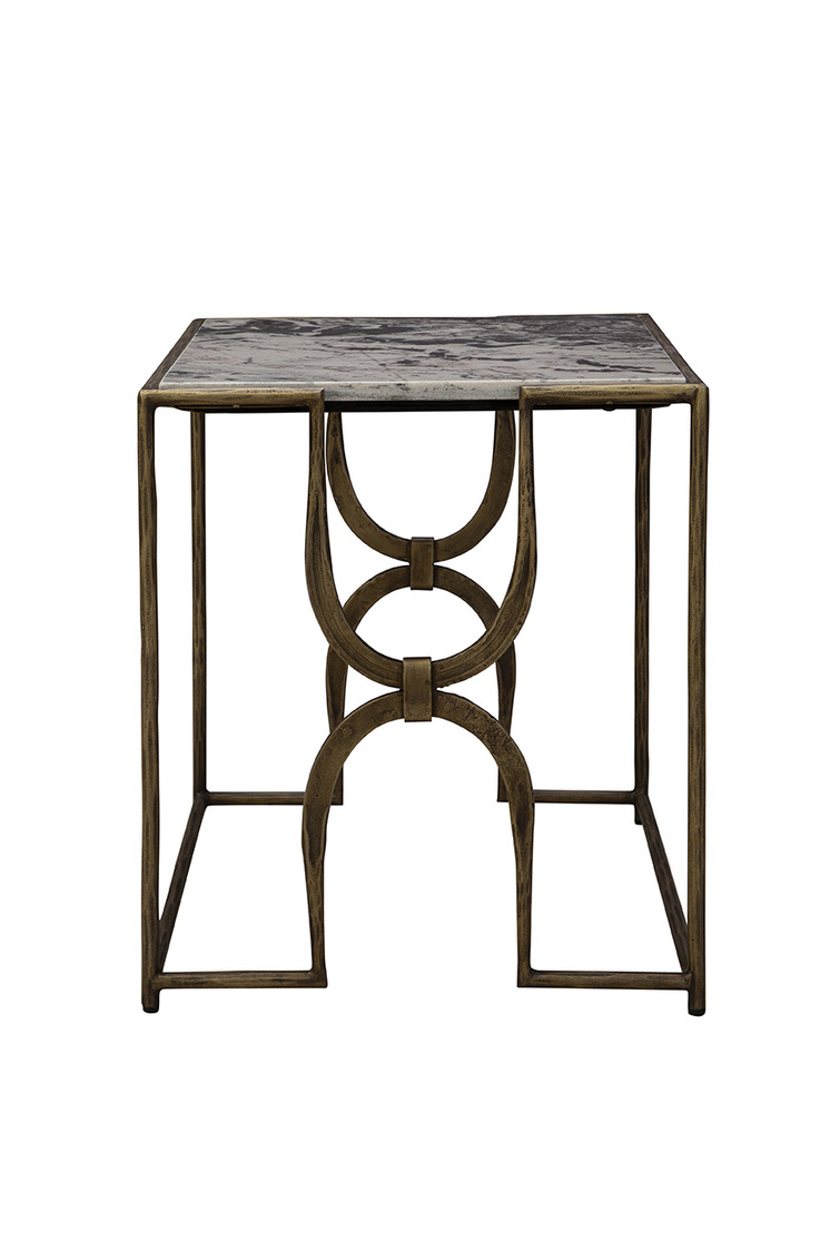 The Sandra End Table brings a contemporary touch to any space. Featuring a square marble tabletop, it rests on a brass cube-shaped base with unique arched details that enhance its modern design. Perfect as an accent piece, this table combines functionality with artistic flair.