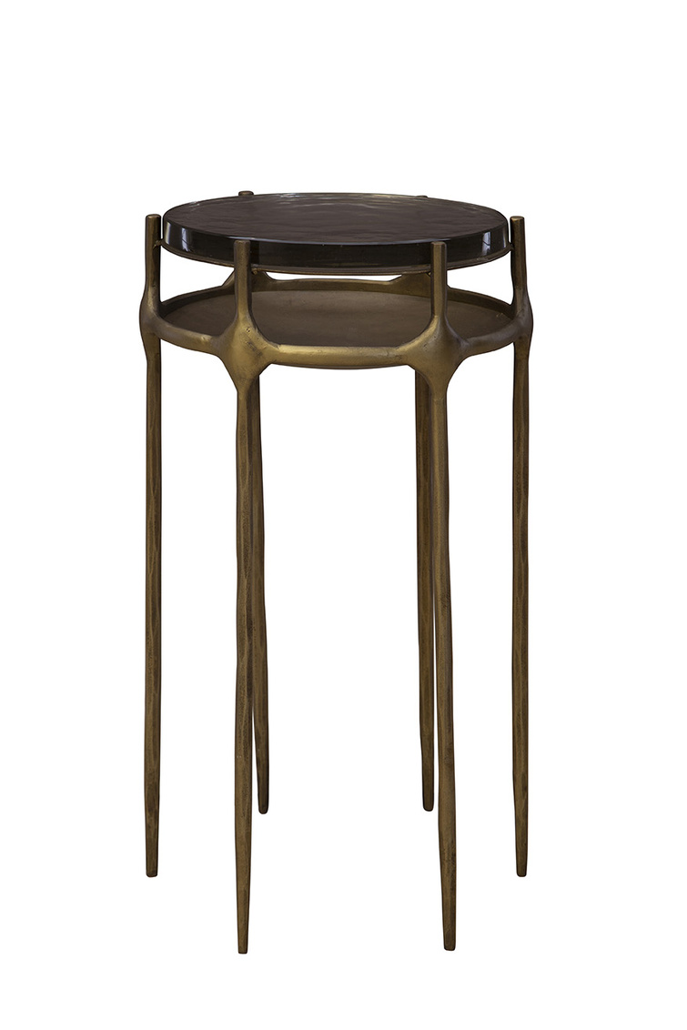 The Sevran Side Table brings a touch of vintage charm with its brass base and timeless materials. Its brass base features six straight-line legs and an upper shelf for added utility and style. The thick, dark-tinted tempered glass top, with its organic texture, adds depth and sophistication, making this table a refined centerpiece for any contemporary space.