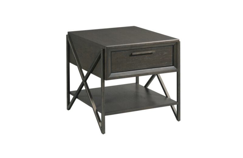 Boasting a timeless look for the classic box on a stand design is our rectangular drawer end table from our Simon collection. This table is constructed of white oak veneers and select hardwoods in a French Press finish. Metal “X” end panels add a modern industrial flare and it features one drawer and one shelf for ample storage.