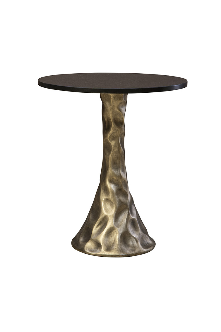 **Final Sale – All Items are sold as is, no returns unless damaged upon receipt. Introducing the Slate Trumpet Table, a little modern masterpiece. The hand-hammered shiny silver base of this table is complemented by a circular black granite top, accentuating the base’s shine and adding a touch of luxury. With its sleek design and contrasting elements, the Slate Trumpet Table is a contemporary piece that brings a stylish and modern aesthetic to any space.