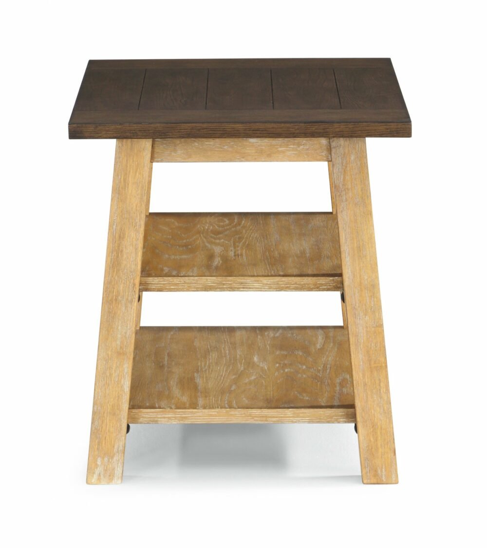 The Tahoe End Table’s character pairs perfectly with your favorite seat in the house. A warm dark brown planked tabletop rests on a natural craftsman trestle base accented by white cerusing that highlights the wood grain. The surface has ample space for extra lighting, a family photo or two, and your morning cup of Joe. Two additional shelves are great for books and magazines.