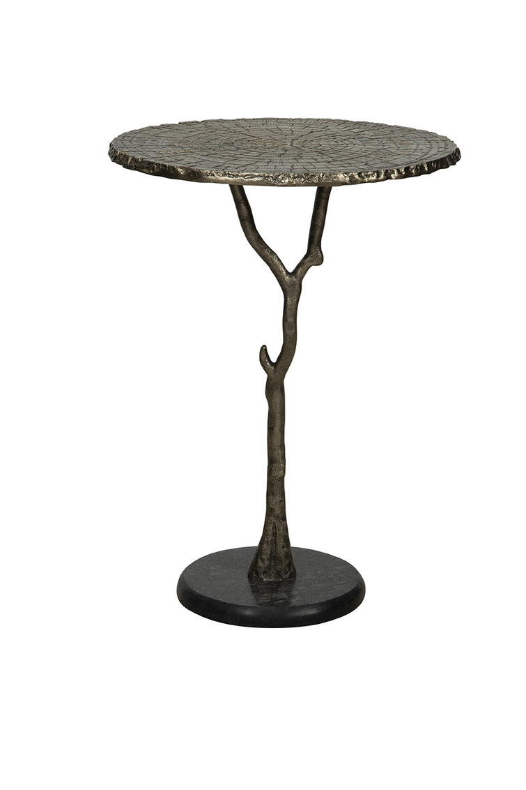 Introducing the Twigs End Table, a stunning blend of artistry and nature-inspired design. Crafted from cast aluminum brushed in gold, the table’s base mimics the graceful shape of a tree branch, while the top emulates a natural tree slice. This piece beautifully combines form and function, drawing inspiration from the beauty of nature to create a unique and practical artistic statement.