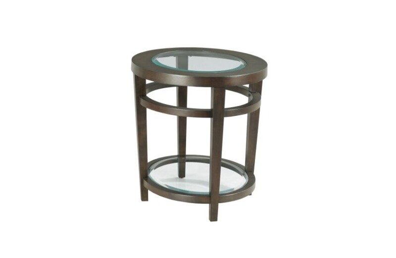 Oval end table is crafted of hardwood solids and quartered oak veneers with tempered glass inserts in a dark oak finish. It is both urban chic and suburban practical with the alluring lines and tempered glass shelf on the bottom for display.