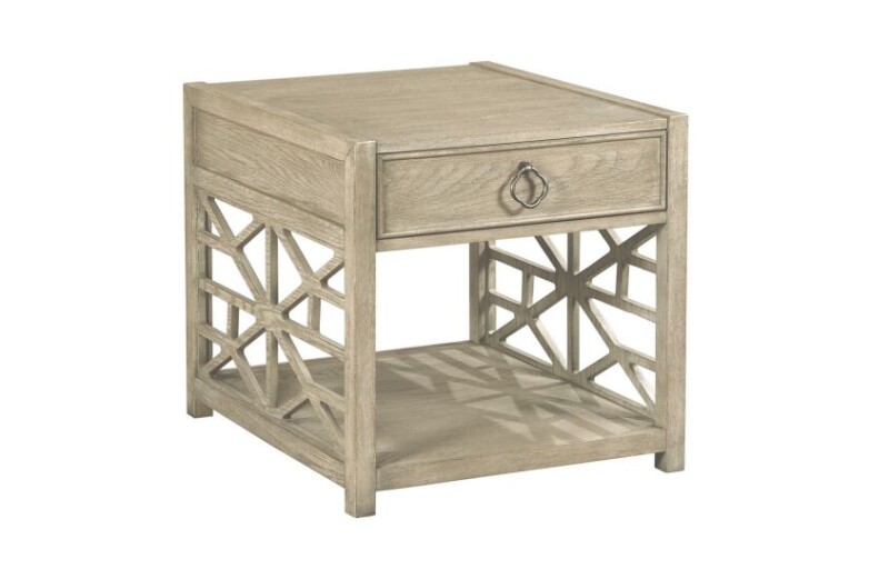 Casual transitional group by utilizing everyday transitional styling and incorporating it with casual elements and accent pieces. Drawer end table has geometric grids on the ends, drawer and shelf for additional storage with a wonderful soft gray tones of the oyster finish.
