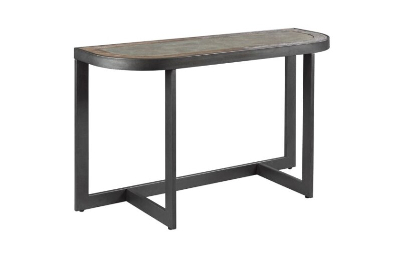 This sofa table has a demilune inspired shape with a metal base featuring a Wrought Iron finish. Adding to this mixed media composition is a top made of white oak veneers with a concrete insert.