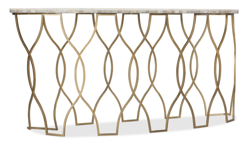 Add a sparkle of timeless Art Deco style to any living space with the Mélange Corrina Sofa Table, blending a gold-leaf metal fretwork base with a White Onyx Parquet top for an airy and uplifting look.